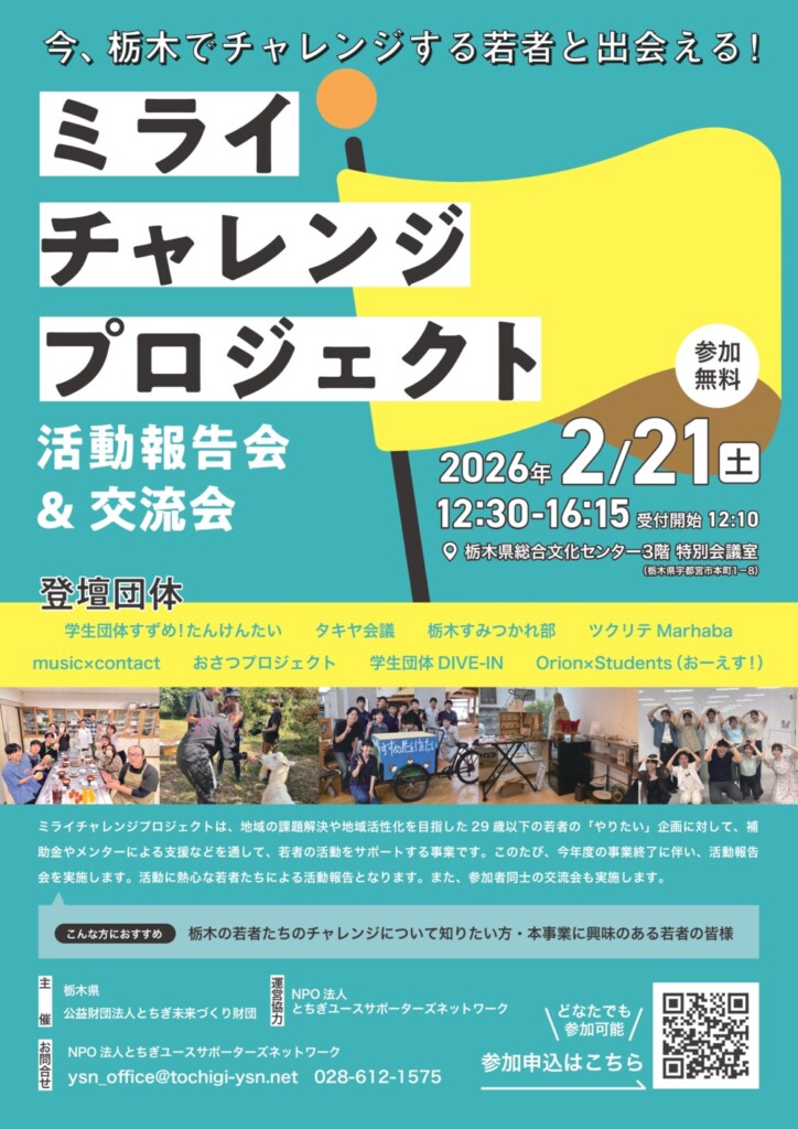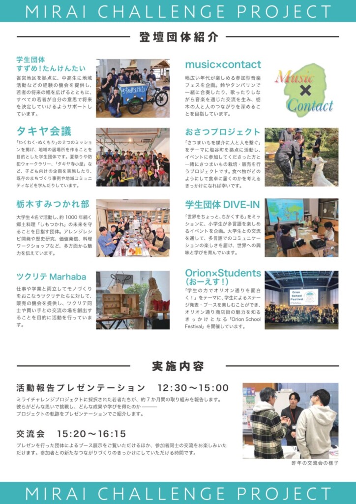 - 内容:ミライチャレンジプロジェクトで助成を受けた団体による活動報告、交流会