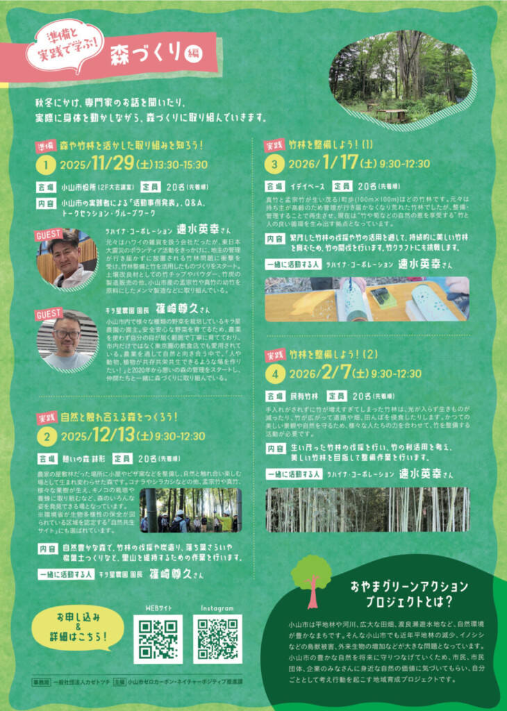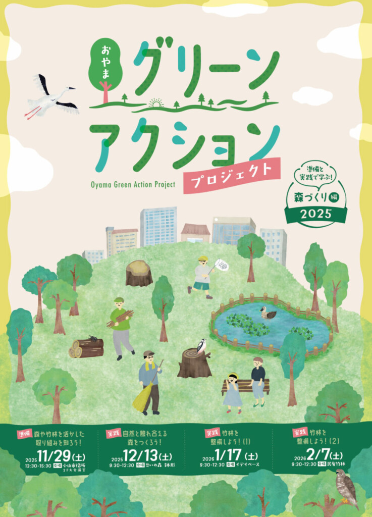 おやまグリーンアクションプロジェクトでは、2025年11月から2026年2月までの秋冬にかけて「準備と実践で学ぶ!森づくり編」を全4回開催します 🙌 🌳 単発参加可能、友人や知人など仲間とのご参加も大歓迎です ❕